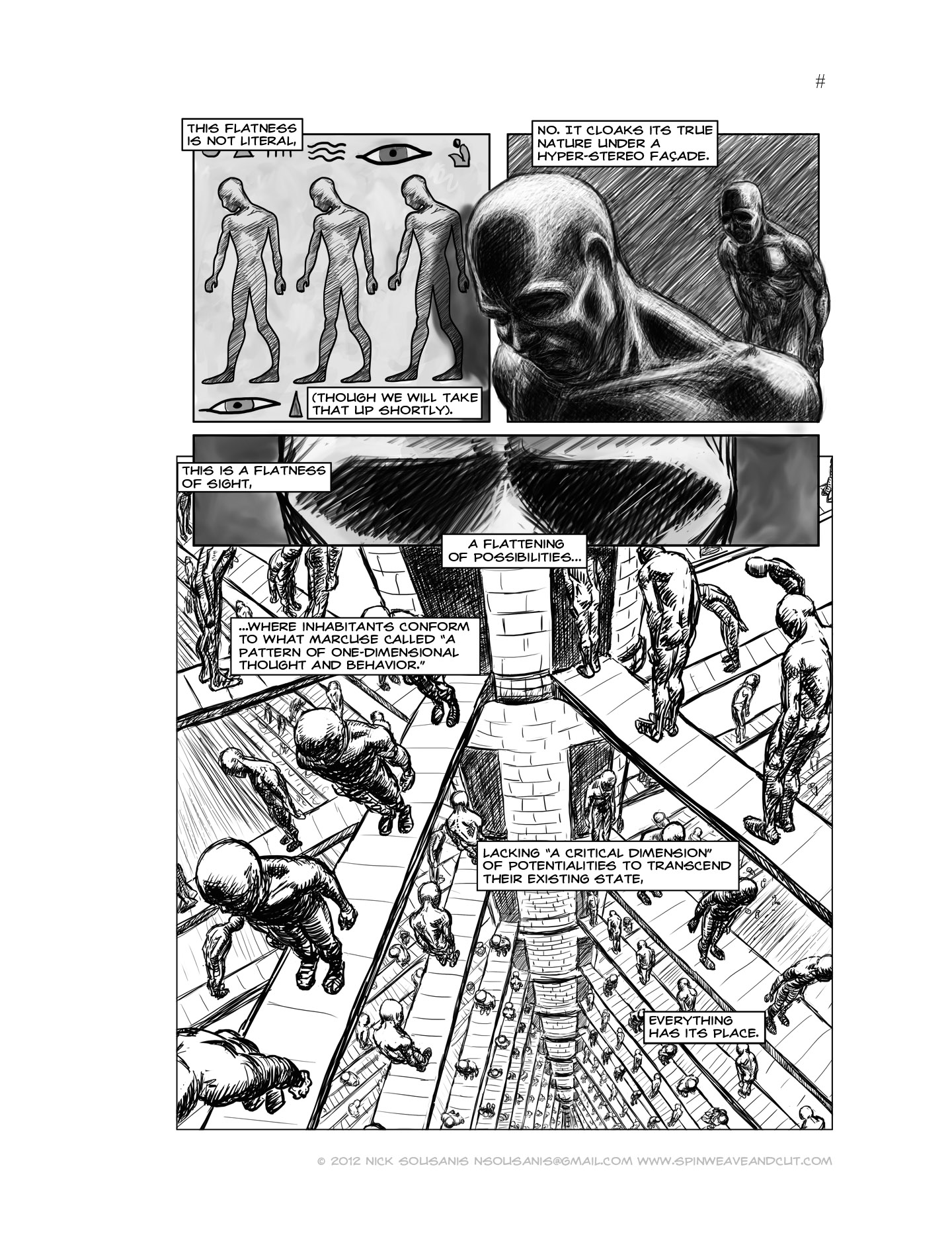 Today I experienced what might be defined as the highlight of my twenty year professional education career.  I met Maxine Greene; writer, philosopher and education activist extraordinaire.  She is as brilliant, warm, and engaging as anyone might imagine.  I was ushered into this personal introduction by Nick Sousanis; artist and scholar-an equally brilliant, warm and engaging individual.  By the end of a day of sharing our individual and collective visions for the future of education, I arrived at my inspiration for this week’s blog.  My title, Escape from Flatness, emerged from looking at some of Nick’s artistic work; using comic book art to create an alternative form of discourse around education issues (among other things).  Principally, Nick recognizes that art, as a form of visual communication, can articulate theories, ideas, and concepts via synchronous forms of narrative engagement.  Some of his illustrations deal with the theme of “flatness.”