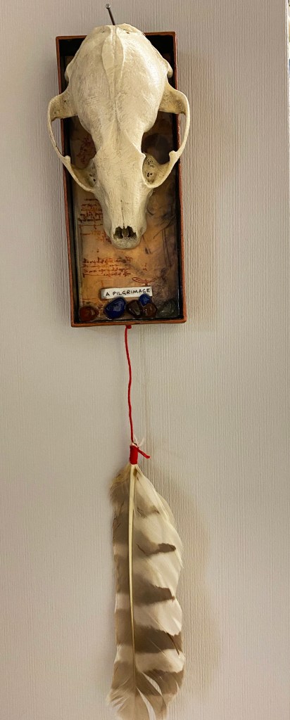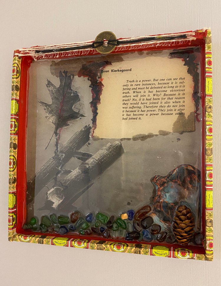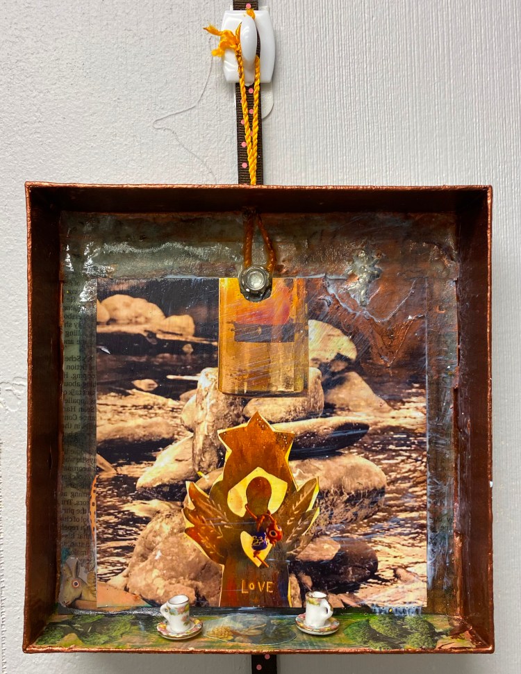 Shadow and Spirit. This shadow box series was created the last 9 months during the pandemic and reflects more spiritual and philosophical angles to my work. Each box ranges in size – from 4″x4″ to 8″ x 8″. Each one is unique and crafted from natural materials, papers, paint and boxes. Each item on this page is available for sale at $40 each. (cash or PayPal. Local delivery upon request) Inquire at mmcdermott@towson.edu. Previous work also available on these other pages.